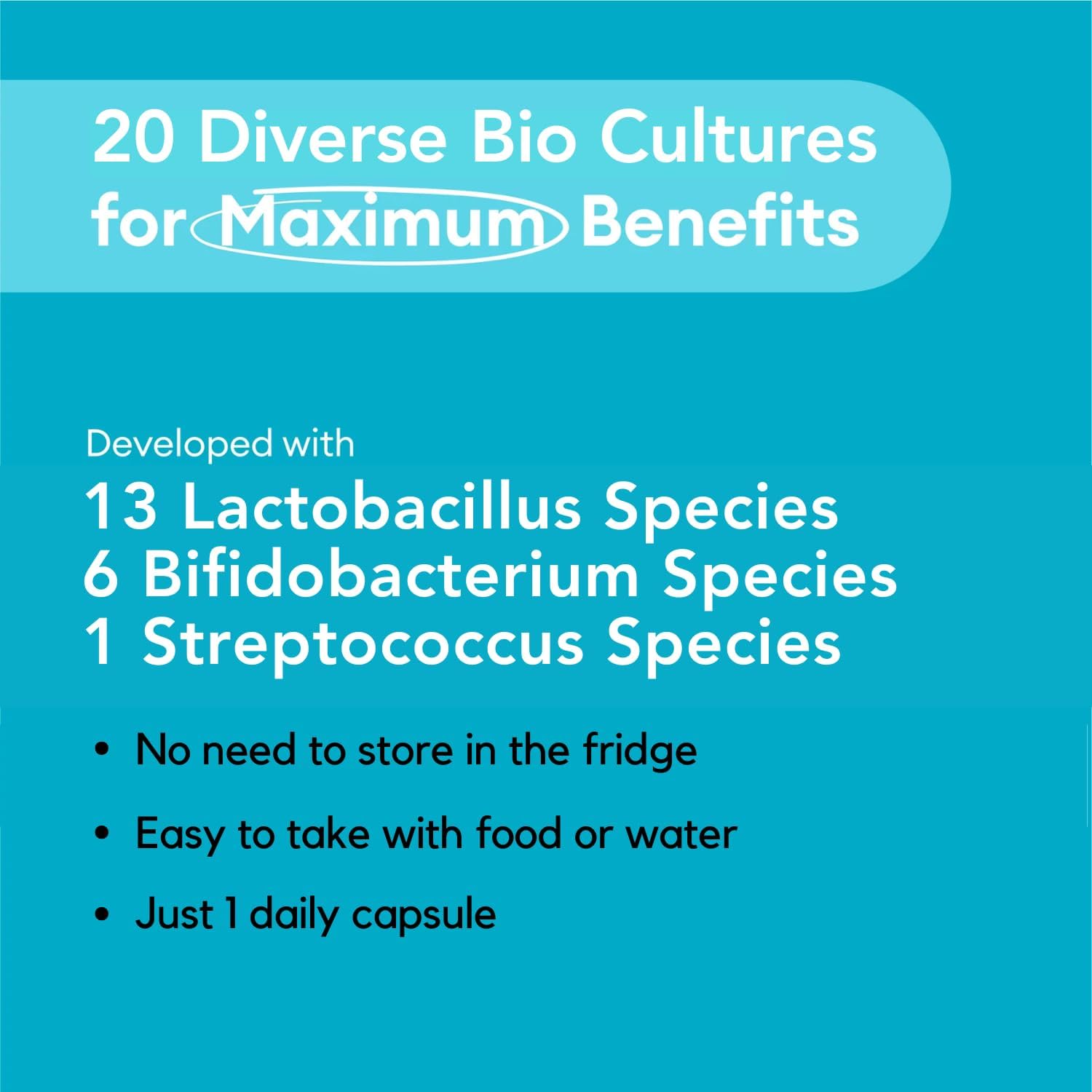 WITH ADDED PREBIOTICS: Our capsules contains 20 diverse high-quality probiotic bio cultures and 2 types of organic prebiotics - working together to support you. Prebiotics acts as food for probiotics and helps them grow.