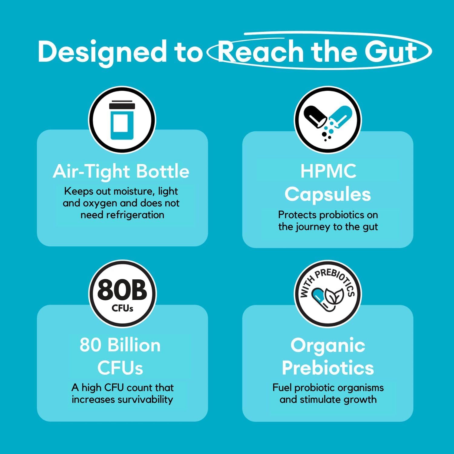 SURVIVES THE GUT: From start to finish - this probiotic is designed to survive the harsh environment inside your gut and maximise the colonisation of our bio cultures. We use a shelf-stable bottle, HPMC capsules, and 80 Billion Colony forming units (CFU) to achieve this.